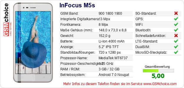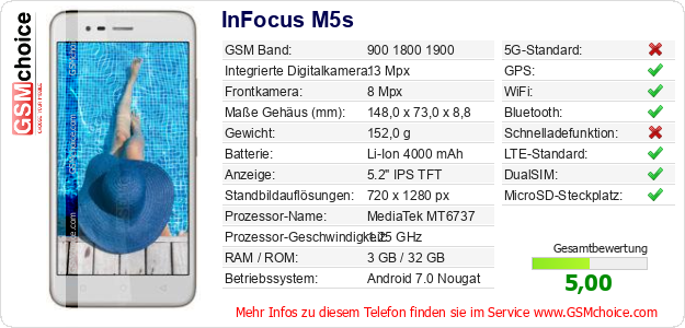 Hast du eigene Webseite? Willst du die Informationen über Standarddaten des Handys InFocus M5s irgendwo veröffentlichen? Das ist sehr einfach. Du kannst das Bild herunterladen oder kopieren und auf der Webseite folgenden Code hinzufügen:Das Einfügen von diesem Code verursacht das Anzeigen von dem folgenden Bild: