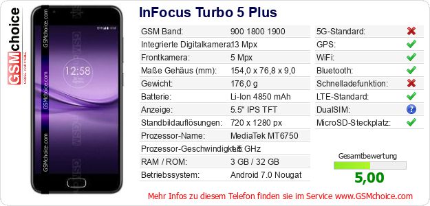 Hast du eigene Webseite? Willst du die Informationen über Standarddaten des Handys InFocus Turbo 5 Plus irgendwo veröffentlichen? Das ist sehr einfach. Du kannst das Bild herunterladen oder kopieren und auf der Webseite folgenden Code hinzufügen:Das Einfügen von diesem Code verursacht das Anzeigen von dem folgenden Bild: