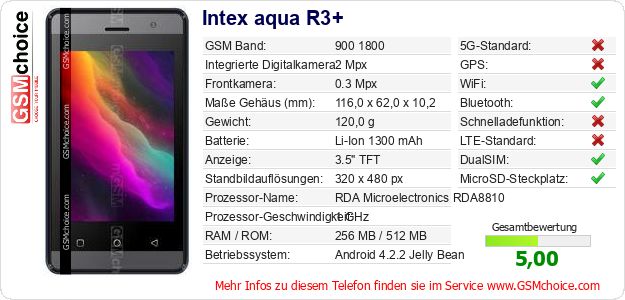 Hast du eigene Webseite? Willst du die Informationen über Standarddaten des Handys Intex aqua R3+ irgendwo veröffentlichen? Das ist sehr einfach. Du kannst das Bild herunterladen oder kopieren und auf der Webseite folgenden Code hinzufügen:Das Einfügen von diesem Code verursacht das Anzeigen von dem folgenden Bild: