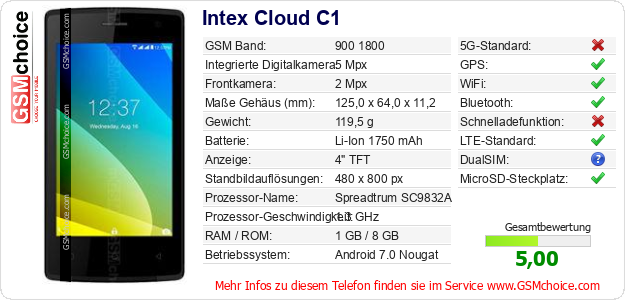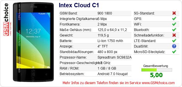 Hast du eigene Webseite? Willst du die Informationen über Standarddaten des Handys Intex Cloud C1 irgendwo veröffentlichen? Das ist sehr einfach. Du kannst das Bild herunterladen oder kopieren und auf der Webseite folgenden Code hinzufügen:Das Einfügen von diesem Code verursacht das Anzeigen von dem folgenden Bild: