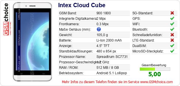 Hast du eigene Webseite? Willst du die Informationen über Standarddaten des Handys Intex Cloud Cube irgendwo veröffentlichen? Das ist sehr einfach. Du kannst das Bild herunterladen oder kopieren und auf der Webseite folgenden Code hinzufügen:Das Einfügen von diesem Code verursacht das Anzeigen von dem folgenden Bild: