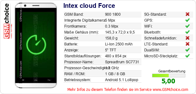 Hast du eigene Webseite? Willst du die Informationen über Standarddaten des Handys Intex cloud Force irgendwo veröffentlichen? Das ist sehr einfach. Du kannst das Bild herunterladen oder kopieren und auf der Webseite folgenden Code hinzufügen:Das Einfügen von diesem Code verursacht das Anzeigen von dem folgenden Bild: