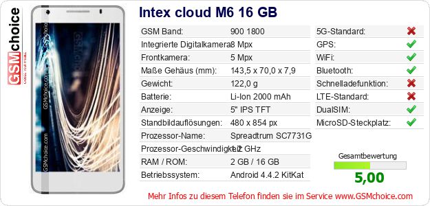 Hast du eigene Webseite? Willst du die Informationen über Standarddaten des Handys Intex cloud M6 16 GB irgendwo veröffentlichen? Das ist sehr einfach. Du kannst das Bild herunterladen oder kopieren und auf der Webseite folgenden Code hinzufügen:Das Einfügen von diesem Code verursacht das Anzeigen von dem folgenden Bild: