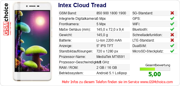 Hast du eigene Webseite? Willst du die Informationen über Standarddaten des Handys Intex Cloud Tread irgendwo veröffentlichen? Das ist sehr einfach. Du kannst das Bild herunterladen oder kopieren und auf der Webseite folgenden Code hinzufügen:Das Einfügen von diesem Code verursacht das Anzeigen von dem folgenden Bild: