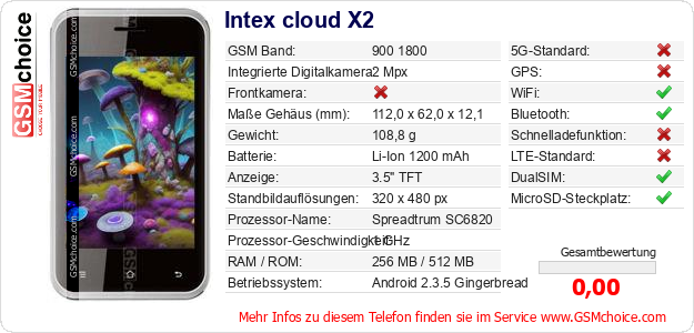 Hast du eigene Webseite? Willst du die Informationen über Standarddaten des Handys Intex cloud X2 irgendwo veröffentlichen? Das ist sehr einfach. Du kannst das Bild herunterladen oder kopieren und auf der Webseite folgenden Code hinzufügen:Das Einfügen von diesem Code verursacht das Anzeigen von dem folgenden Bild: