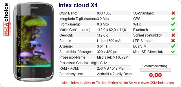 Hast du eigene Webseite? Willst du die Informationen über Standarddaten des Handys Intex cloud X4 irgendwo veröffentlichen? Das ist sehr einfach. Du kannst das Bild herunterladen oder kopieren und auf der Webseite folgenden Code hinzufügen:Das Einfügen von diesem Code verursacht das Anzeigen von dem folgenden Bild: