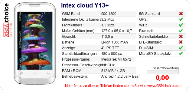 Hast du eigene Webseite? Willst du die Informationen über Standarddaten des Handys Intex cloud Y13+ irgendwo veröffentlichen? Das ist sehr einfach. Du kannst das Bild herunterladen oder kopieren und auf der Webseite folgenden Code hinzufügen:Das Einfügen von diesem Code verursacht das Anzeigen von dem folgenden Bild: