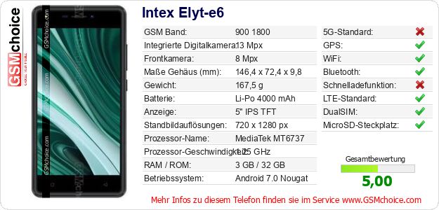 Hast du eigene Webseite? Willst du die Informationen über Standarddaten des Handys Intex Elyt-e6 irgendwo veröffentlichen? Das ist sehr einfach. Du kannst das Bild herunterladen oder kopieren und auf der Webseite folgenden Code hinzufügen:Das Einfügen von diesem Code verursacht das Anzeigen von dem folgenden Bild: