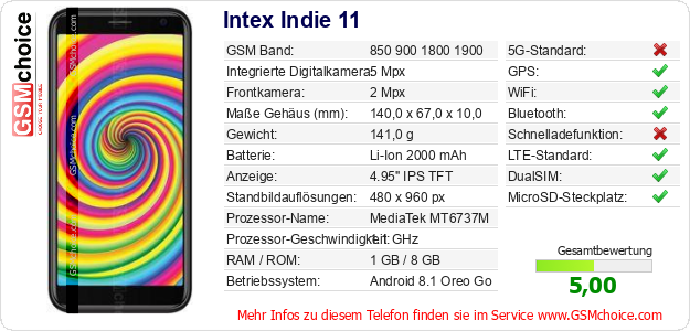 Hast du eigene Webseite? Willst du die Informationen über Standarddaten des Handys Intex Indie 11 irgendwo veröffentlichen? Das ist sehr einfach. Du kannst das Bild herunterladen oder kopieren und auf der Webseite folgenden Code hinzufügen:Das Einfügen von diesem Code verursacht das Anzeigen von dem folgenden Bild: