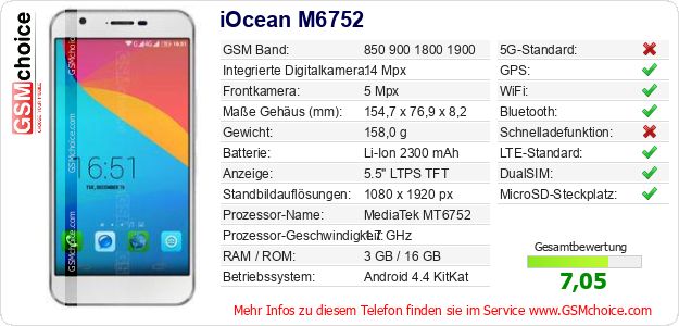 Hast du eigene Webseite? Willst du die Informationen über Standarddaten des Handys iOcean M6752 irgendwo veröffentlichen? Das ist sehr einfach. Du kannst das Bild herunterladen oder kopieren und auf der Webseite folgenden Code hinzufügen:Das Einfügen von diesem Code verursacht das Anzeigen von dem folgenden Bild: