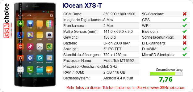 Hast du eigene Webseite? Willst du die Informationen über Standarddaten des Handys iOcean X7S-T irgendwo veröffentlichen? Das ist sehr einfach. Du kannst das Bild herunterladen oder kopieren und auf der Webseite folgenden Code hinzufügen:Das Einfügen von diesem Code verursacht das Anzeigen von dem folgenden Bild: