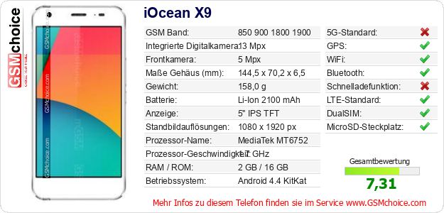 Hast du eigene Webseite? Willst du die Informationen über Standarddaten des Handys iOcean X9 irgendwo veröffentlichen? Das ist sehr einfach. Du kannst das Bild herunterladen oder kopieren und auf der Webseite folgenden Code hinzufügen:Das Einfügen von diesem Code verursacht das Anzeigen von dem folgenden Bild: