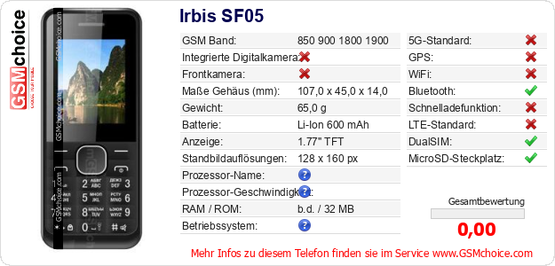 Hast du eigene Webseite? Willst du die Informationen über Standarddaten des Handys Irbis SF05 irgendwo veröffentlichen? Das ist sehr einfach. Du kannst das Bild herunterladen oder kopieren und auf der Webseite folgenden Code hinzufügen:Das Einfügen von diesem Code verursacht das Anzeigen von dem folgenden Bild:
