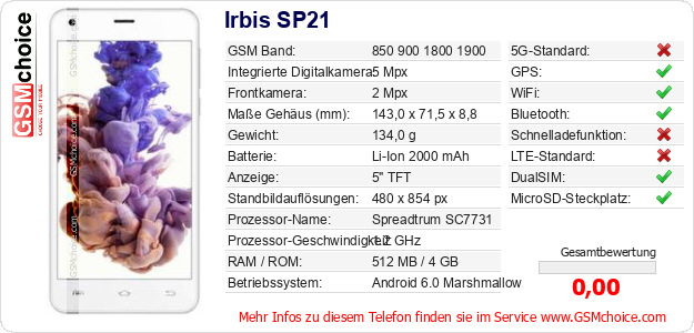 Hast du eigene Webseite? Willst du die Informationen über Standarddaten des Handys Irbis SP21 irgendwo veröffentlichen? Das ist sehr einfach. Du kannst das Bild herunterladen oder kopieren und auf der Webseite folgenden Code hinzufügen:Das Einfügen von diesem Code verursacht das Anzeigen von dem folgenden Bild: