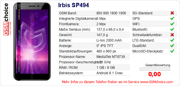 Hast du eigene Webseite? Willst du die Informationen über Standarddaten des Handys Irbis SP494 irgendwo veröffentlichen? Das ist sehr einfach. Du kannst das Bild herunterladen oder kopieren und auf der Webseite folgenden Code hinzufügen:Das Einfügen von diesem Code verursacht das Anzeigen von dem folgenden Bild: