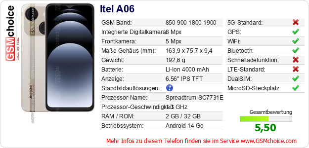 Hast du eigene Webseite? Willst du die Informationen über Standarddaten des Handys Itel A06 irgendwo veröffentlichen? Das ist sehr einfach. Du kannst das Bild herunterladen oder kopieren und auf der Webseite folgenden Code hinzufügen:Das Einfügen von diesem Code verursacht das Anzeigen von dem folgenden Bild: