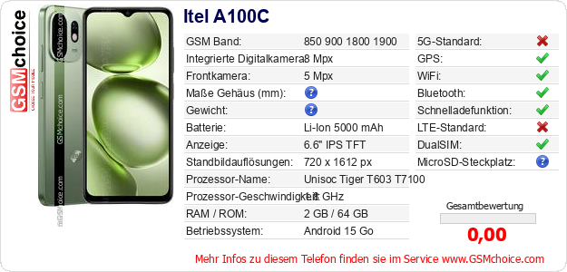 Hast du eigene Webseite? Willst du die Informationen über Standarddaten des Handys Itel A100C irgendwo veröffentlichen? Das ist sehr einfach. Du kannst das Bild herunterladen oder kopieren und auf der Webseite folgenden Code hinzufügen:Das Einfügen von diesem Code verursacht das Anzeigen von dem folgenden Bild: