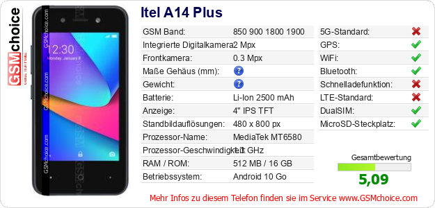 Hast du eigene Webseite? Willst du die Informationen über Standarddaten des Handys Itel A14 Plus irgendwo veröffentlichen? Das ist sehr einfach. Du kannst das Bild herunterladen oder kopieren und auf der Webseite folgenden Code hinzufügen:Das Einfügen von diesem Code verursacht das Anzeigen von dem folgenden Bild: