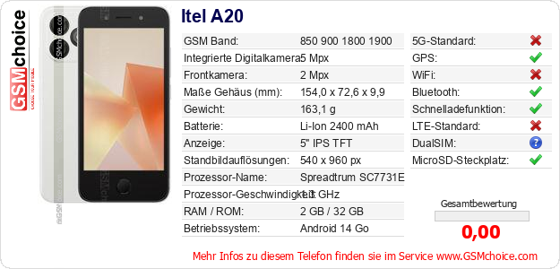 Hast du eigene Webseite? Willst du die Informationen über Standarddaten des Handys Itel A20 irgendwo veröffentlichen? Das ist sehr einfach. Du kannst das Bild herunterladen oder kopieren und auf der Webseite folgenden Code hinzufügen:Das Einfügen von diesem Code verursacht das Anzeigen von dem folgenden Bild: