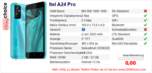 Hast du eigene Webseite? Willst du die Informationen über Standarddaten des Handys Itel A24 Pro irgendwo veröffentlichen? Das ist sehr einfach. Du kannst das Bild herunterladen oder kopieren und auf der Webseite folgenden Code hinzufügen:Das Einfügen von diesem Code verursacht das Anzeigen von dem folgenden Bild: