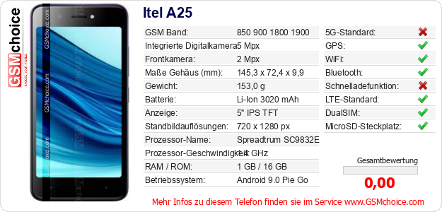 Hast du eigene Webseite? Willst du die Informationen über Standarddaten des Handys Itel A25 irgendwo veröffentlichen? Das ist sehr einfach. Du kannst das Bild herunterladen oder kopieren und auf der Webseite folgenden Code hinzufügen:Das Einfügen von diesem Code verursacht das Anzeigen von dem folgenden Bild: