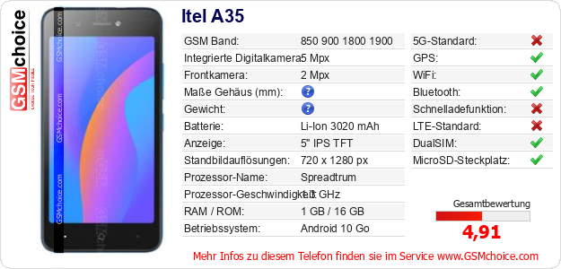 Hast du eigene Webseite? Willst du die Informationen über Standarddaten des Handys Itel A35 irgendwo veröffentlichen? Das ist sehr einfach. Du kannst das Bild herunterladen oder kopieren und auf der Webseite folgenden Code hinzufügen:Das Einfügen von diesem Code verursacht das Anzeigen von dem folgenden Bild: