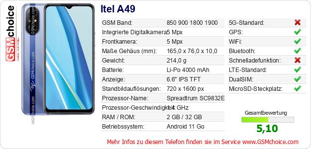 Hast du eigene Webseite? Willst du die Informationen über Standarddaten des Handys Itel A49 irgendwo veröffentlichen? Das ist sehr einfach. Du kannst das Bild herunterladen oder kopieren und auf der Webseite folgenden Code hinzufügen:Das Einfügen von diesem Code verursacht das Anzeigen von dem folgenden Bild: