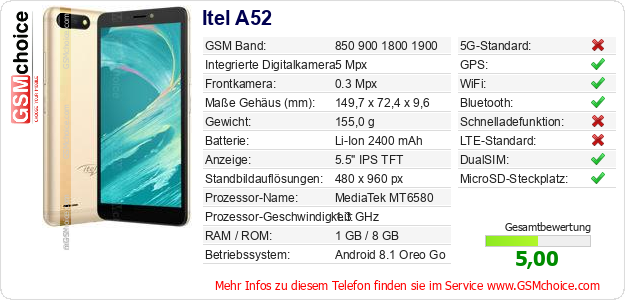 Hast du eigene Webseite? Willst du die Informationen über Standarddaten des Handys Itel A52 irgendwo veröffentlichen? Das ist sehr einfach. Du kannst das Bild herunterladen oder kopieren und auf der Webseite folgenden Code hinzufügen:Das Einfügen von diesem Code verursacht das Anzeigen von dem folgenden Bild: