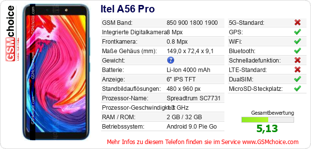 Hast du eigene Webseite? Willst du die Informationen über Standarddaten des Handys Itel A56 Pro irgendwo veröffentlichen? Das ist sehr einfach. Du kannst das Bild herunterladen oder kopieren und auf der Webseite folgenden Code hinzufügen:Das Einfügen von diesem Code verursacht das Anzeigen von dem folgenden Bild: