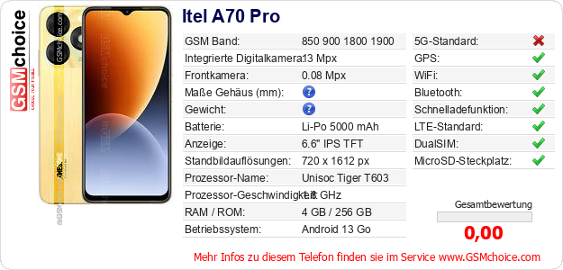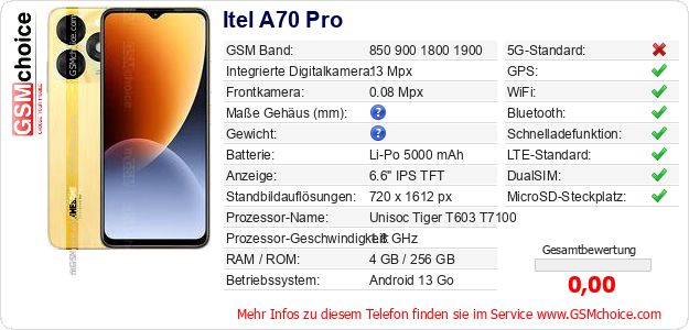 Hast du eigene Webseite? Willst du die Informationen über Standarddaten des Handys Itel A70 Pro irgendwo veröffentlichen? Das ist sehr einfach. Du kannst das Bild herunterladen oder kopieren und auf der Webseite folgenden Code hinzufügen:Das Einfügen von diesem Code verursacht das Anzeigen von dem folgenden Bild: