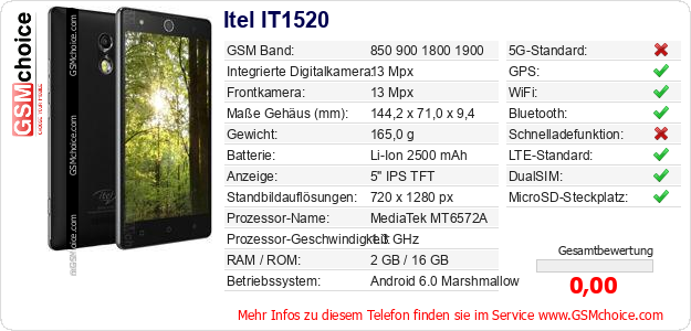 Hast du eigene Webseite? Willst du die Informationen über Standarddaten des Handys Itel IT1520 irgendwo veröffentlichen? Das ist sehr einfach. Du kannst das Bild herunterladen oder kopieren und auf der Webseite folgenden Code hinzufügen:Das Einfügen von diesem Code verursacht das Anzeigen von dem folgenden Bild: