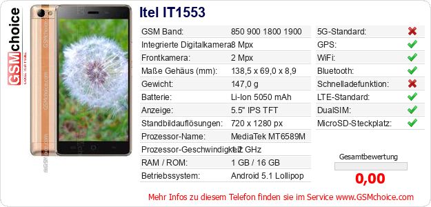 Hast du eigene Webseite? Willst du die Informationen über Standarddaten des Handys Itel IT1553 irgendwo veröffentlichen? Das ist sehr einfach. Du kannst das Bild herunterladen oder kopieren und auf der Webseite folgenden Code hinzufügen:Das Einfügen von diesem Code verursacht das Anzeigen von dem folgenden Bild: