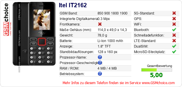 Hast du eigene Webseite? Willst du die Informationen über Standarddaten des Handys Itel IT2162 irgendwo veröffentlichen? Das ist sehr einfach. Du kannst das Bild herunterladen oder kopieren und auf der Webseite folgenden Code hinzufügen:Das Einfügen von diesem Code verursacht das Anzeigen von dem folgenden Bild: