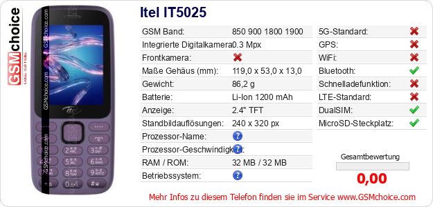 Hast du eigene Webseite? Willst du die Informationen über Standarddaten des Handys Itel IT5025 irgendwo veröffentlichen? Das ist sehr einfach. Du kannst das Bild herunterladen oder kopieren und auf der Webseite folgenden Code hinzufügen:Das Einfügen von diesem Code verursacht das Anzeigen von dem folgenden Bild: