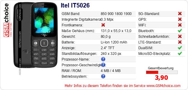 Hast du eigene Webseite? Willst du die Informationen über Standarddaten des Handys Itel IT5026 irgendwo veröffentlichen? Das ist sehr einfach. Du kannst das Bild herunterladen oder kopieren und auf der Webseite folgenden Code hinzufügen:Das Einfügen von diesem Code verursacht das Anzeigen von dem folgenden Bild: