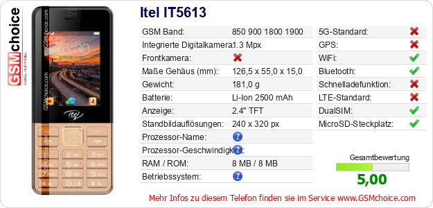 Hast du eigene Webseite? Willst du die Informationen über Standarddaten des Handys Itel IT5613 irgendwo veröffentlichen? Das ist sehr einfach. Du kannst das Bild herunterladen oder kopieren und auf der Webseite folgenden Code hinzufügen:Das Einfügen von diesem Code verursacht das Anzeigen von dem folgenden Bild: