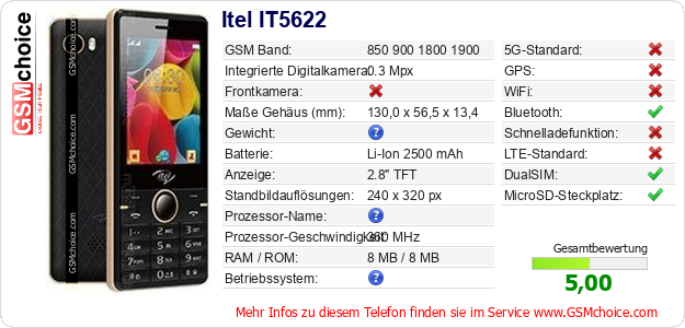 Hast du eigene Webseite? Willst du die Informationen über Standarddaten des Handys Itel IT5622 irgendwo veröffentlichen? Das ist sehr einfach. Du kannst das Bild herunterladen oder kopieren und auf der Webseite folgenden Code hinzufügen:Das Einfügen von diesem Code verursacht das Anzeigen von dem folgenden Bild: