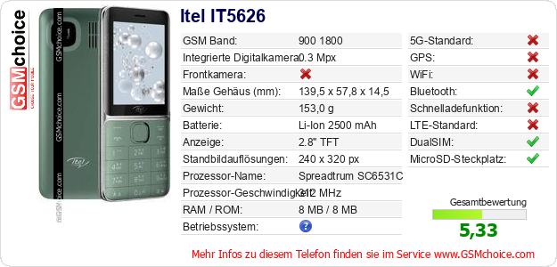 Hast du eigene Webseite? Willst du die Informationen über Standarddaten des Handys Itel IT5626 irgendwo veröffentlichen? Das ist sehr einfach. Du kannst das Bild herunterladen oder kopieren und auf der Webseite folgenden Code hinzufügen:Das Einfügen von diesem Code verursacht das Anzeigen von dem folgenden Bild: