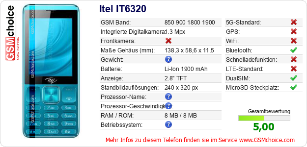 Hast du eigene Webseite? Willst du die Informationen über Standarddaten des Handys Itel IT6320 irgendwo veröffentlichen? Das ist sehr einfach. Du kannst das Bild herunterladen oder kopieren und auf der Webseite folgenden Code hinzufügen:Das Einfügen von diesem Code verursacht das Anzeigen von dem folgenden Bild: