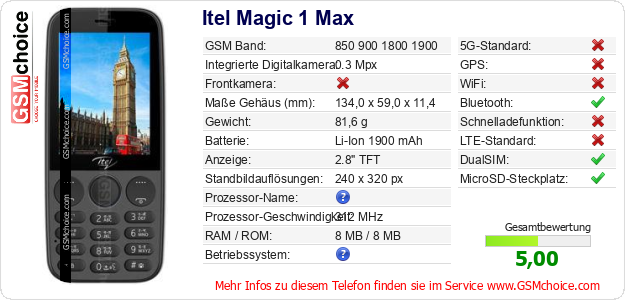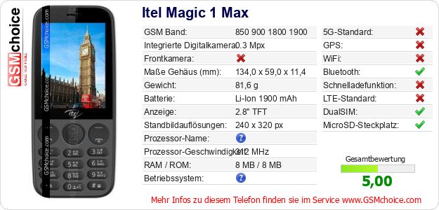 Hast du eigene Webseite? Willst du die Informationen über Standarddaten des Handys Itel Magic 1 Max irgendwo veröffentlichen? Das ist sehr einfach. Du kannst das Bild herunterladen oder kopieren und auf der Webseite folgenden Code hinzufügen:Das Einfügen von diesem Code verursacht das Anzeigen von dem folgenden Bild: