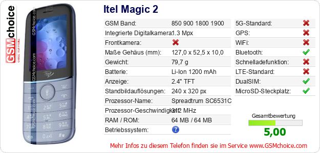 Hast du eigene Webseite? Willst du die Informationen über Standarddaten des Handys Itel Magic 2 irgendwo veröffentlichen? Das ist sehr einfach. Du kannst das Bild herunterladen oder kopieren und auf der Webseite folgenden Code hinzufügen:Das Einfügen von diesem Code verursacht das Anzeigen von dem folgenden Bild: