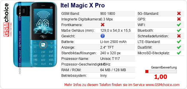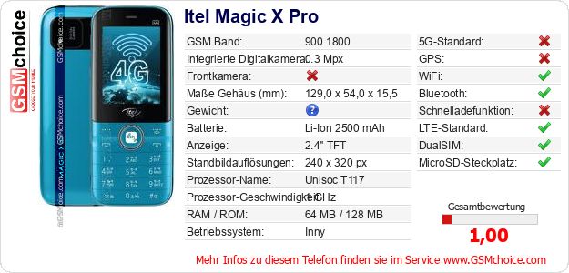 Hast du eigene Webseite? Willst du die Informationen über Standarddaten des Handys Itel Magic X Pro irgendwo veröffentlichen? Das ist sehr einfach. Du kannst das Bild herunterladen oder kopieren und auf der Webseite folgenden Code hinzufügen:Das Einfügen von diesem Code verursacht das Anzeigen von dem folgenden Bild: