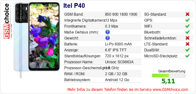 Hast du eigene Webseite? Willst du die Informationen über Standarddaten des Handys Itel P40 irgendwo veröffentlichen? Das ist sehr einfach. Du kannst das Bild herunterladen oder kopieren und auf der Webseite folgenden Code hinzufügen:Das Einfügen von diesem Code verursacht das Anzeigen von dem folgenden Bild: