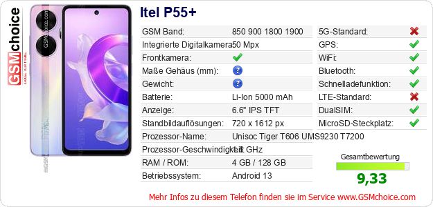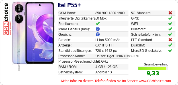 Hast du eigene Webseite? Willst du die Informationen über Standarddaten des Handys Itel P55+ irgendwo veröffentlichen? Das ist sehr einfach. Du kannst das Bild herunterladen oder kopieren und auf der Webseite folgenden Code hinzufügen:Das Einfügen von diesem Code verursacht das Anzeigen von dem folgenden Bild:
