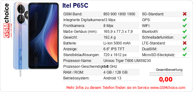 Hast du eigene Webseite? Willst du die Informationen über Standarddaten des Handys Itel P65C irgendwo veröffentlichen? Das ist sehr einfach. Du kannst das Bild herunterladen oder kopieren und auf der Webseite folgenden Code hinzufügen:Das Einfügen von diesem Code verursacht das Anzeigen von dem folgenden Bild:
