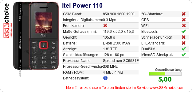 Hast du eigene Webseite? Willst du die Informationen über Standarddaten des Handys Itel Power 110 irgendwo veröffentlichen? Das ist sehr einfach. Du kannst das Bild herunterladen oder kopieren und auf der Webseite folgenden Code hinzufügen:Das Einfügen von diesem Code verursacht das Anzeigen von dem folgenden Bild: