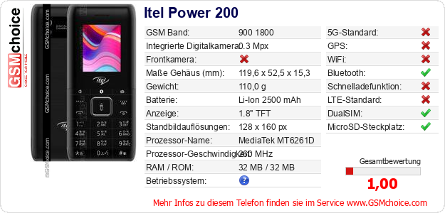 Hast du eigene Webseite? Willst du die Informationen über Standarddaten des Handys Itel Power 200 irgendwo veröffentlichen? Das ist sehr einfach. Du kannst das Bild herunterladen oder kopieren und auf der Webseite folgenden Code hinzufügen:Das Einfügen von diesem Code verursacht das Anzeigen von dem folgenden Bild: