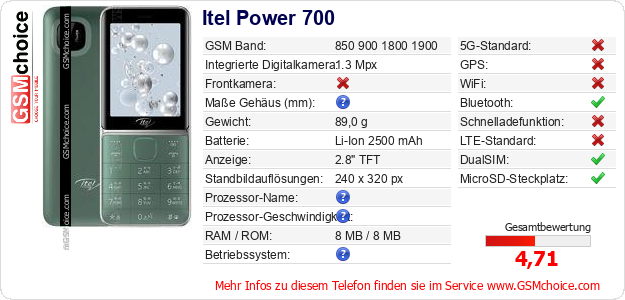 Hast du eigene Webseite? Willst du die Informationen über Standarddaten des Handys Itel Power 700 irgendwo veröffentlichen? Das ist sehr einfach. Du kannst das Bild herunterladen oder kopieren und auf der Webseite folgenden Code hinzufügen:Das Einfügen von diesem Code verursacht das Anzeigen von dem folgenden Bild: