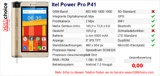 Hast du eigene Webseite? Willst du die Informationen über Standarddaten des Handys Itel Power Pro P41 irgendwo veröffentlichen? Das ist sehr einfach. Du kannst das Bild herunterladen oder kopieren und auf der Webseite folgenden Code hinzufügen:Das Einfügen von diesem Code verursacht das Anzeigen von dem folgenden Bild: