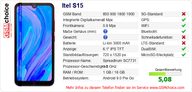 Hast du eigene Webseite? Willst du die Informationen über Standarddaten des Handys Itel S15 irgendwo veröffentlichen? Das ist sehr einfach. Du kannst das Bild herunterladen oder kopieren und auf der Webseite folgenden Code hinzufügen:Das Einfügen von diesem Code verursacht das Anzeigen von dem folgenden Bild: